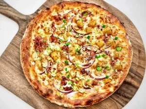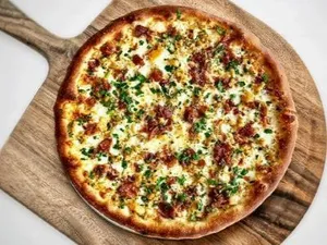 mozzarella, provolone, roasted yukon gold potatoes, bacon, slow-roasted garlic, red and green onions, hot red pepper flakes (no tomato sauce)