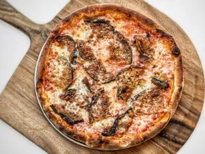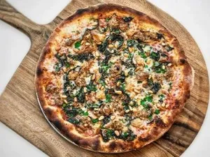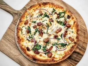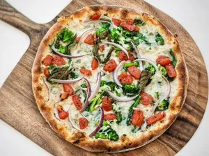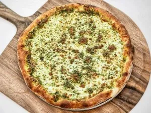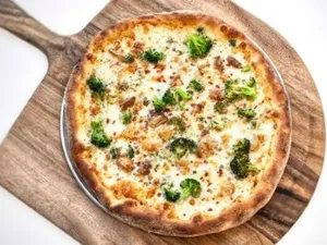 mozzarella, provolone, broccoli, housemade mild italian sausage, slow-roasted garlic, hot red pepper flakes (no tomato sauce)