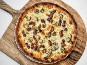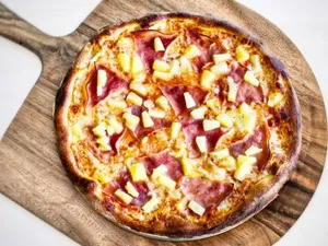 Our Hawaiian is topped with Bacon , Ham, Pineapple, Pizza Sauce.