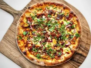 Our BBQ Chicken is topped with Bacon , BBQ Sauce, Chicken, Red Onions.