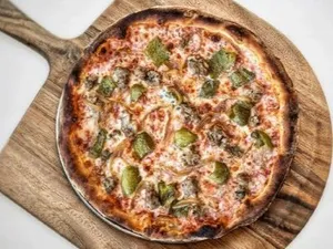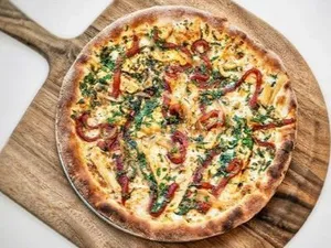 Our Chicken Parm is topped with Chicken, Red Onions, Oregano, Green Peppers, Pizza Sauce, Tomato.