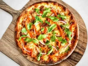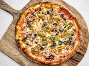 Our Veggie is topped with Mushroom, Black Olives, Red Onions, Green Peppers, Pizza Sauce, Tomato.