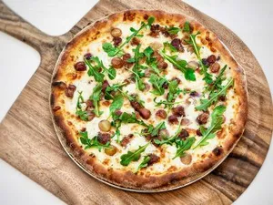 pancetta, scarlet royal grapes, goat cheese, wild baby arugula (no tomato sauce)