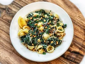 kale, hot italian sausage, slow-roasted garlic, parmesan, pine nuts, meyer lemon olive oil